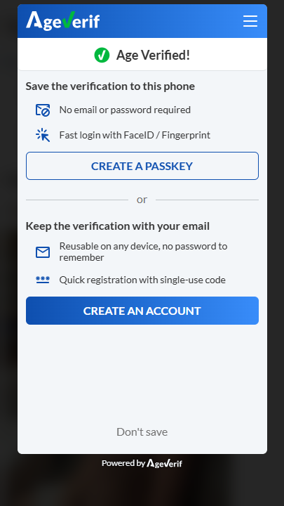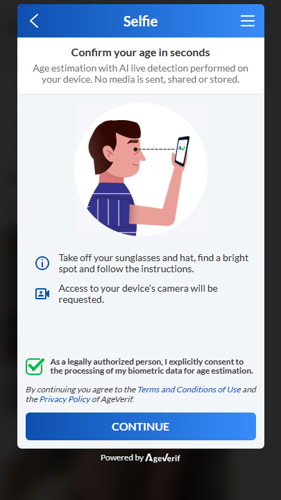 Content-Security-Policy: script-src 'self' https://www.ageverif.com; frame-src https://checker.ageverif.com; connect-src 'self' https://www.ageverif.com https://wstats.ageverif.com; - If the visitor is already verified for the current session, the Checker is not displayed.